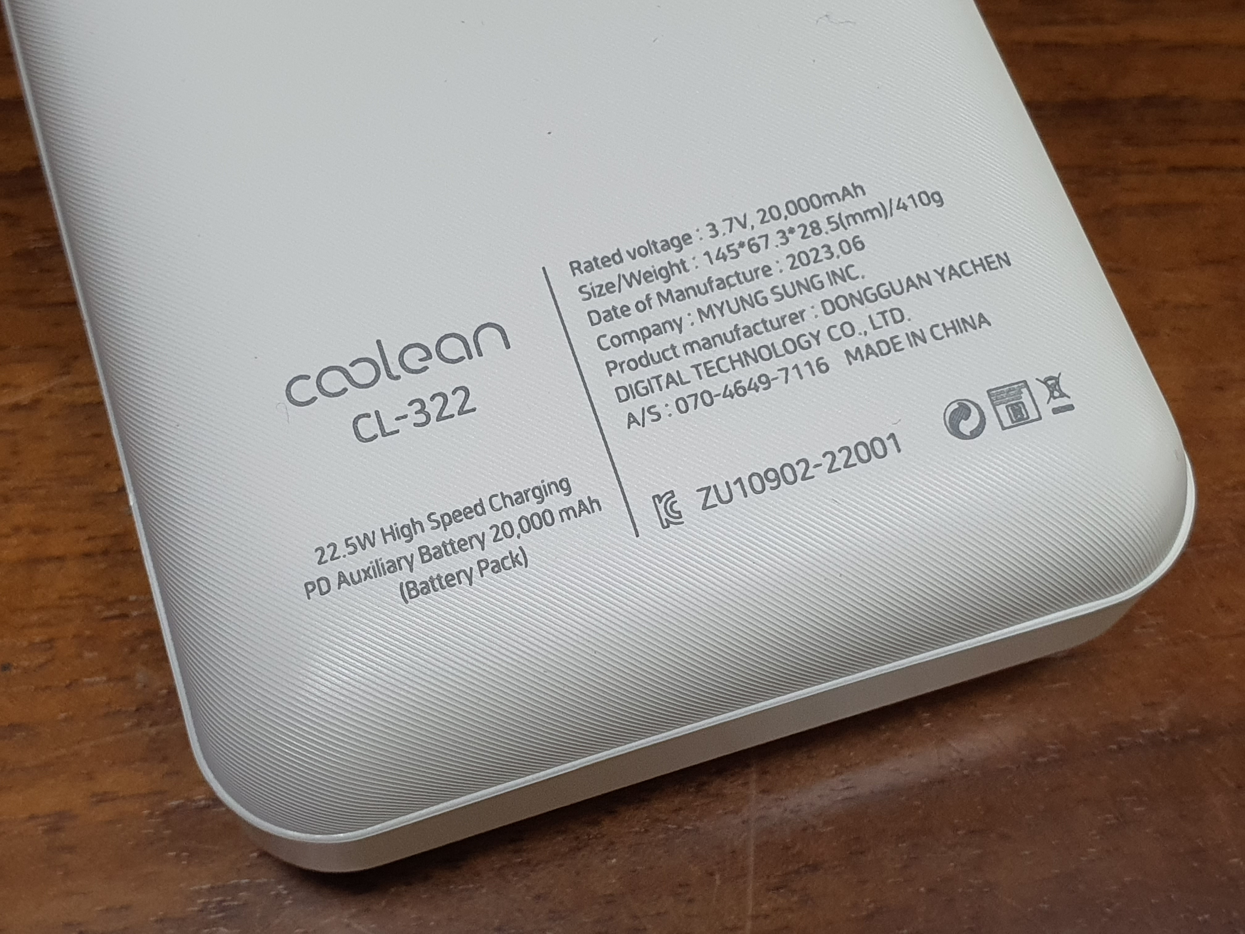 쿨린 (coolean) CL322 보조배터리 뒷면 하단에는 간단한 제원이 적혀 있어요. 22.5W 출력을 제공해서 고속충전도 무리없이 지원됩니다.
